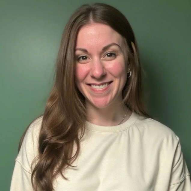 A headshot of Lindsey, a brown-haired woman with pale skin, wearing no make-up and an off-white long sleeve shirt, standing in front of a moss green background.