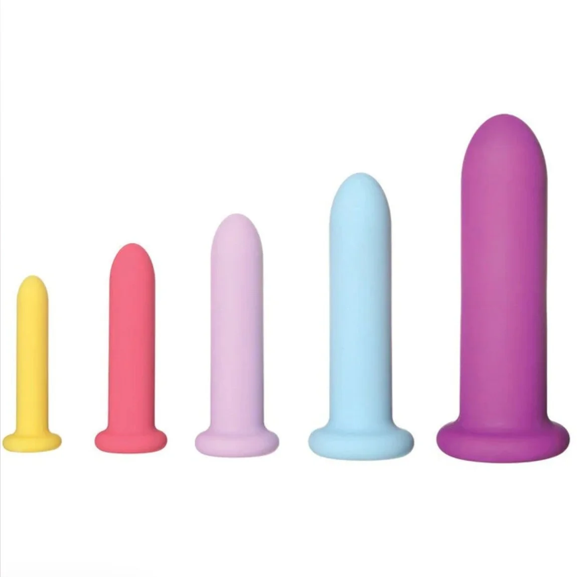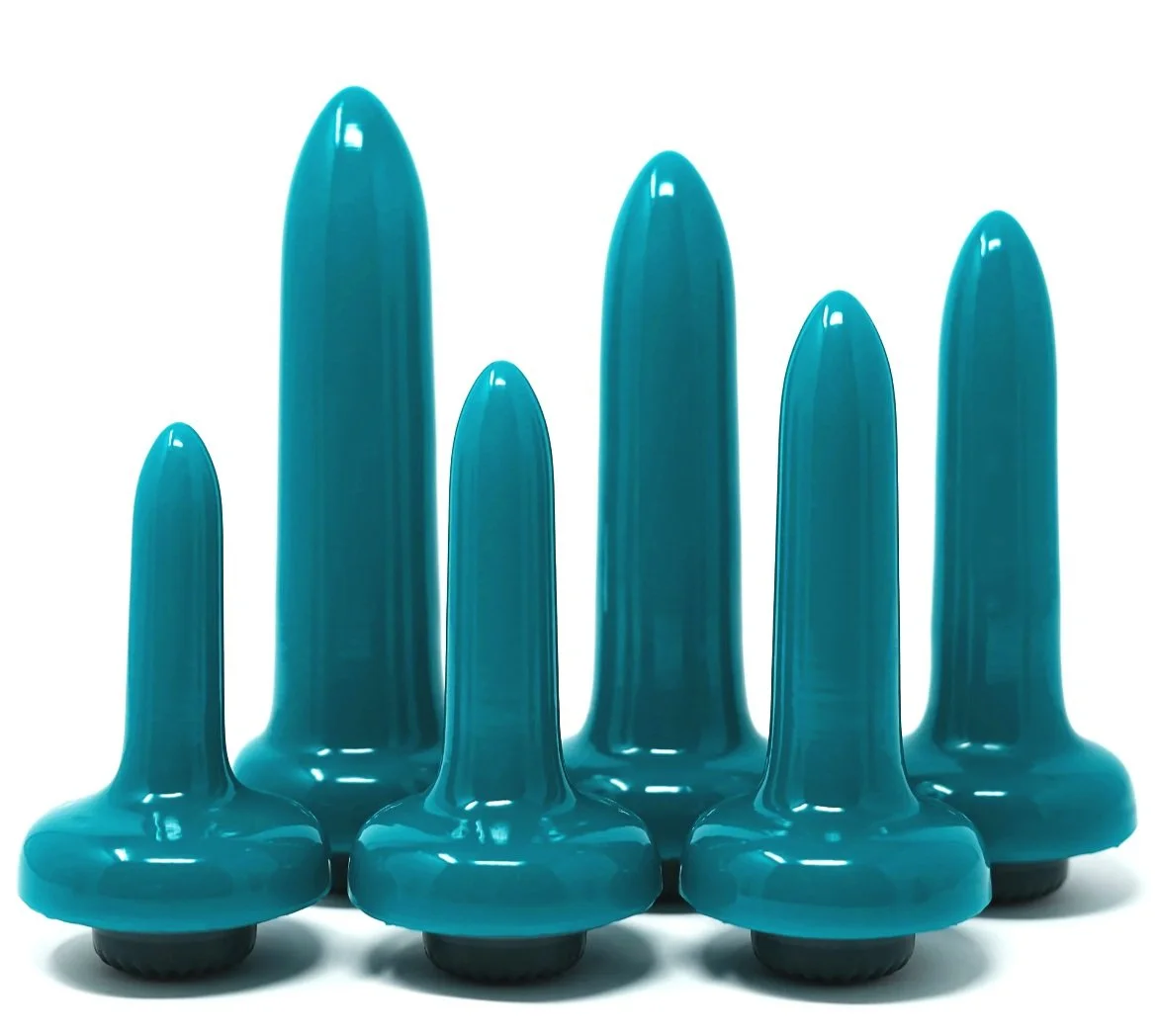 These vaginal dilators have silky smooth silicone tapered tips which make for easy insertion and comfort. There are 8 sizes making transitions between sizes gradual, and the bases are wide making for better grip. Use with water-based lubricant.