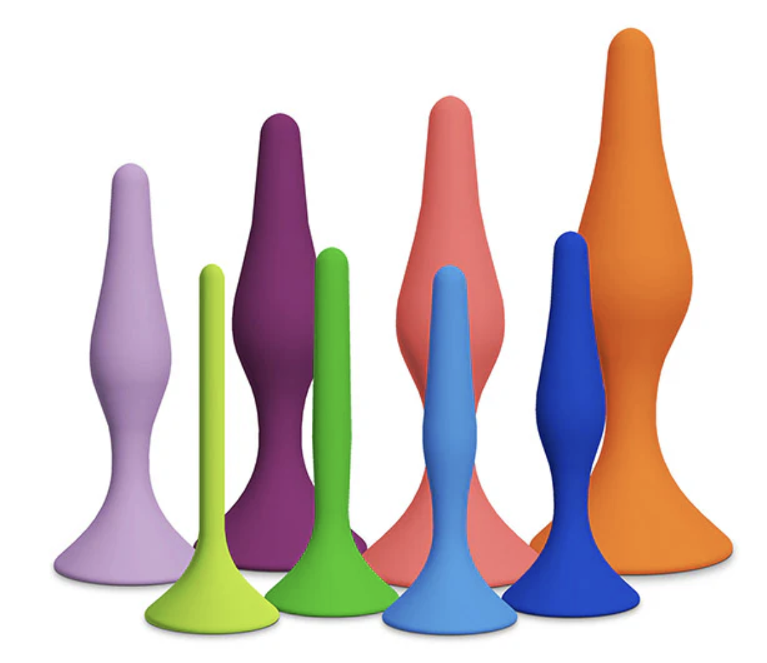 A set of all 8 sizes of anal plugs made of silicone. Each has a tapered tip with a tighter neck. The set of 3 allows the user to move up as they become comfortable with the size gradually. Use with water-based lubricant.